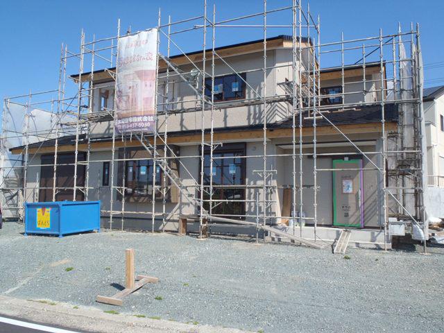 サイディング材ジョイント部、軒天取り合いコーキング打ちへと進めます。 木工事、天井ボード貼りを終え、2階床フローリング下地、