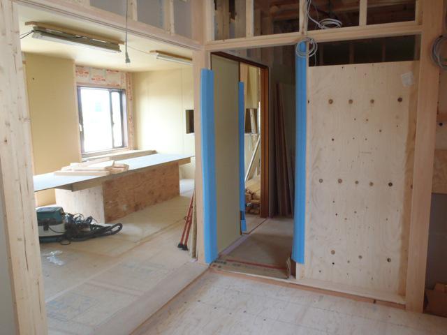 入ります。 内部木工事、キッチン廻り下地造作ドア開口枠取付、