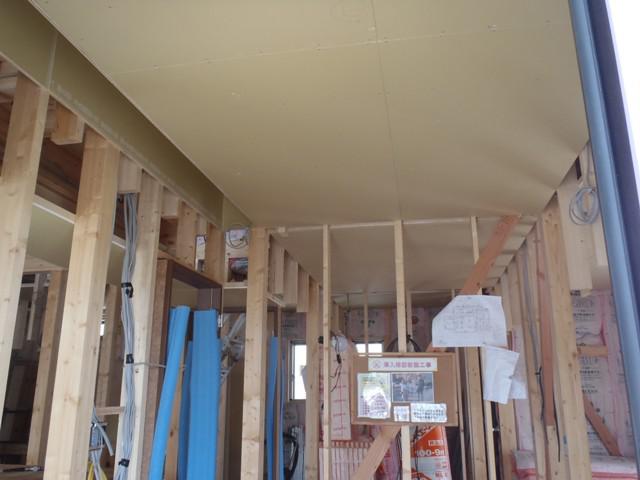 木工事、2階床フローリング貼り床養生を終え、1階天井下地 組み、天井ボード貼りを行っています。天井造作を終え ましたら2階より窓枠組立・取付、壁下地合板・プラスターボード