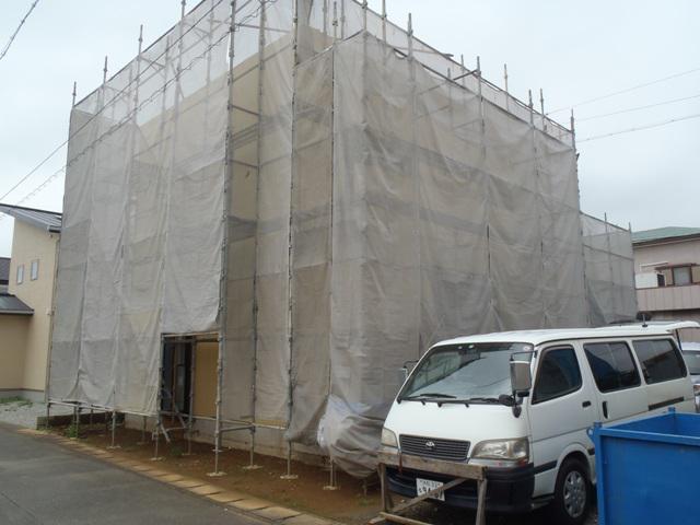 ・外部工事、土台水切り板金取付、外壁下地(透湿防水シート)を