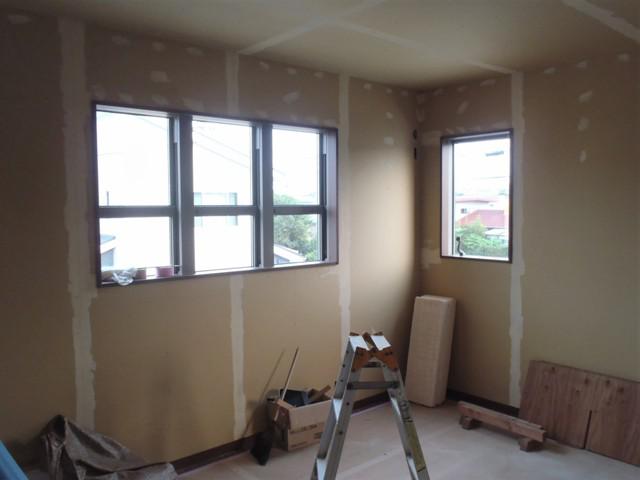 同時進行にて、クロス下地・パテ入れ、クロス貼りを進めています。