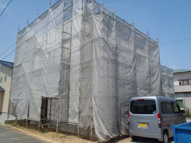 ・4日保証機構による外装下地検査を受け、外部木工事 外壁下地材打ち、軒天下地組み及び軒天ボード貼りを 終え、内部造作天井ボード貼り、壁断熱材入れ進めて います。床フローリング材が搬入され、断熱完了後フローリング 貼りを2階より進めます。 ・当社夏季休暇を9日より16日まで頂きます。
