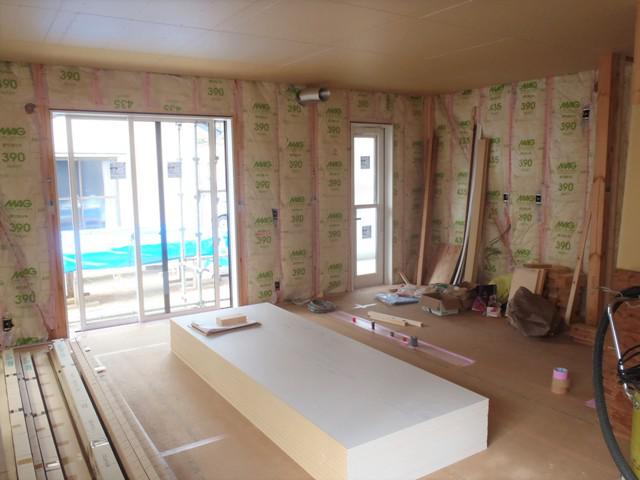 木工事(壁断熱材入れ、窓枠・ドア枠組立、取付、壁下地合板・