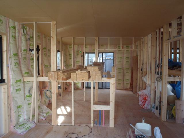 進めています。 壁断熱材入れ、床フローリング貼りへと行って