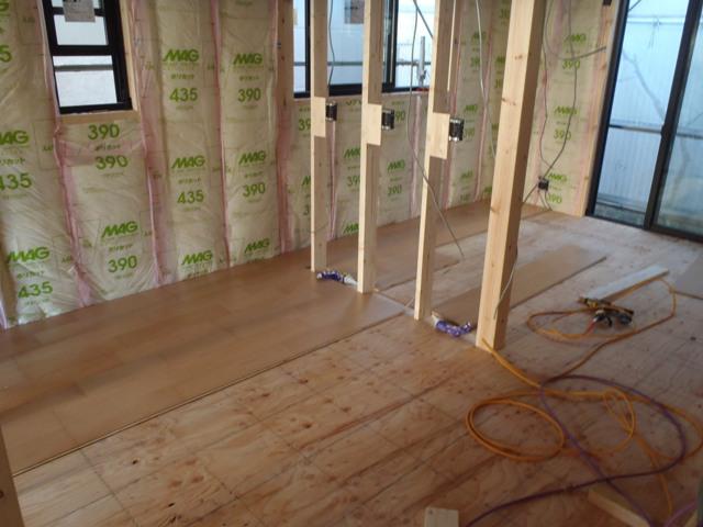・内部木工事、床フローリング貼りし終えた部屋より床養生敷き