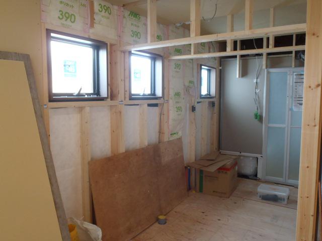 ☆先週の工事☆ 木工事(窓枠・ドア開口枠取付、壁下地合板・プラスターボード 貼り、他) 外部足場解体 電力引き込み ☆今週の予定工事☆ 木工事(ドア開口枠取付、壁下地合板・プラスターボード貼り、他)