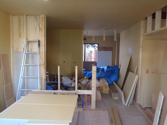 ☆先週の工事☆ 木工事(ドア開口枠取付、壁下地合板・プラスターボード貼り、他) 浄化槽設置 ☆今週の予定工事☆ 木工事(ドア開口枠取付、壁下地合板・プラスターボード貼り、 固定棚取付、他) キッチンカップボード据付 キッチン据付