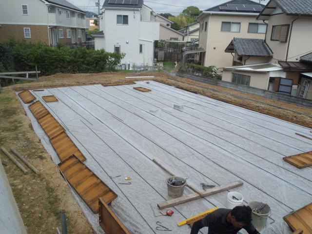 ・基礎工事、砕石地業、土間シート敷きを終え、ベース型枠組み 鉄筋加工へ入りました。 鉄筋組み、給排水土間にげ配管を 終えましたら 保証機構JIO配筋検査(鉄筋組み状況、型枠と 鉄筋との間隔等確認)を受け、ベースコンクリート打ちを行います。