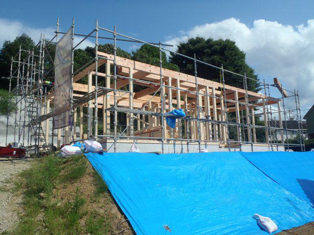・上棟おめでとうございます!天候にも恵まれ 柱・梁・小屋組み、 屋根下地と行う事が出来ました。 木工事、宜しくお願いします。 ・屋根工事、下地防水紙ルーフィング葺き、カラーベスト葺きに入ります。
