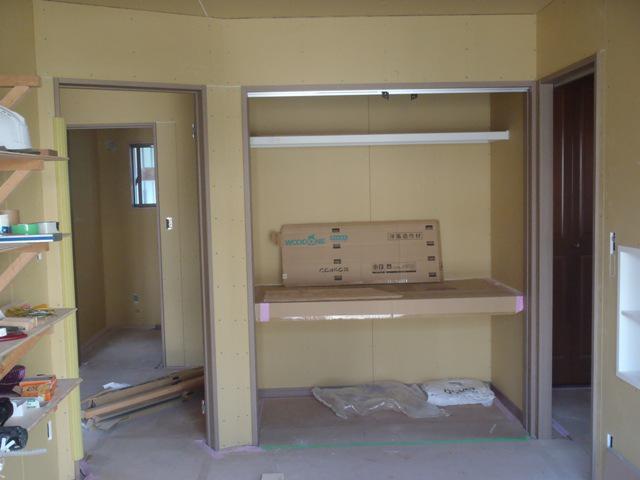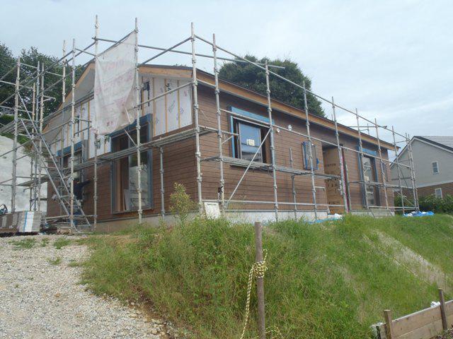 ・外壁サイディング貼りが完了しサイディングジョイント部・サッシ廻り等 コーキング打ちへ入ります。 コーキング材乾き次第、軒天塗装へ入ります。 ・内部造作ありがとうございます。内装クロス、照明器具の件を 打合せ宜しくお願いします。
