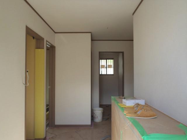 ・内装仕上げクロス貼りが完了しました。 電気スイッチ・コンセント類、衛生器具付けへと入ります。 ・外部換気フード類取付、基礎幅木塗へと入り週末外部足場 解体となります。