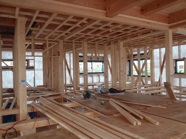 外壁下地材打ち、軒天下地組み、内部木工事、天井下地組み