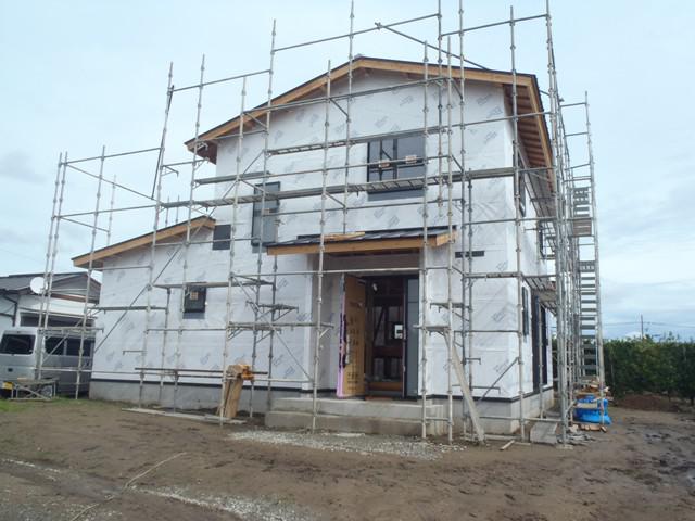 木工事(壁断熱材入れ、外壁下地材打ち、軒天下地組み、