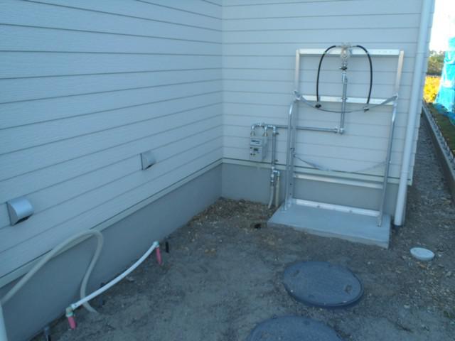 ・玄関、ポーチタイル貼り、タイル目地埋め完了となります。 電力引き込みポール設置、スイッチコンセントプレート類 照明器具付け、配電盤納め、通電致します。