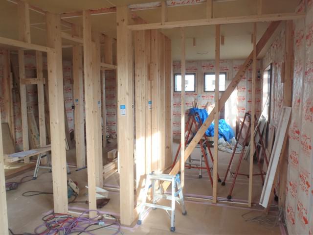 ・壁断熱材を納め、壁ボード貼り、ドア開口枠取付へと