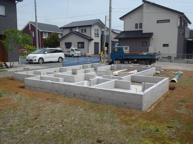 ・基礎工事、立ち上がり部の型枠組み、アンカーボルト類 設置、立ち上がり部コンクリート打ち、立ち上り部型枠解体、 浴室・タイル下地土間コンクリート打ち、基礎廻り埋め戻し 整地を行い基礎工事完了となります。 ・連休明けより上棟に向け準備を進めて行きます。 当社GW休暇を4月29日より5月5日まで頂きます。