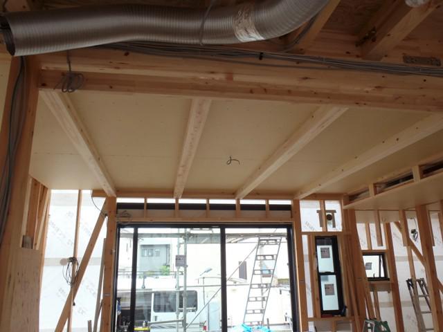 ・木工事、1階天井下地組み及び天井ボード貼り、下屋天井