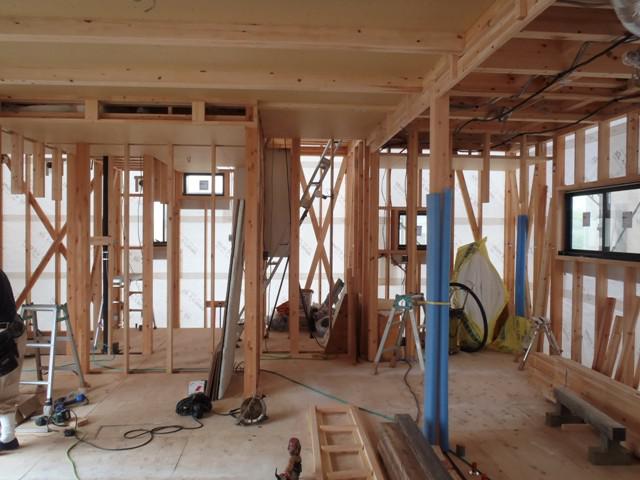 引き続き1階天井下地・ボード貼り、壁下地打ち、壁断熱材