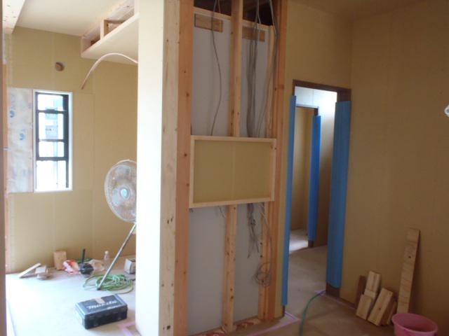 ・内部木工事、1階壁下地合板・ボード貼りが粗方となり2階 壁下地へと取り掛かりました。 ・キッチン・ヌックスペースのニッチ開口を仮組みしました。 ご確認ください。 ・外部板金工事完了しました。1日太陽光パネルより配線を建物 引き込みします。