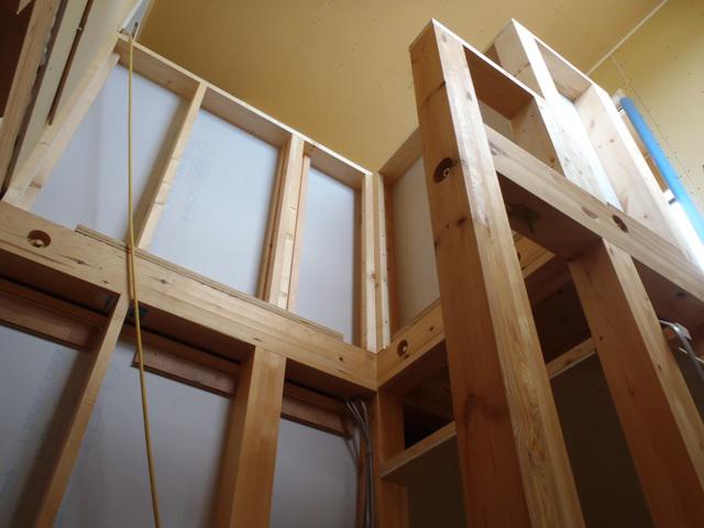 ☆先週のの工事☆ 木工事(2階壁下地合板・プラスターボード貼り、ドア開口枠 取付、固定棚板取付、幅木・廻し縁取付、他) ☆今週の予定工事☆ 木工事(階段造作、1階幅木・廻し縁取付、壁プラスター ボード貼り、他)