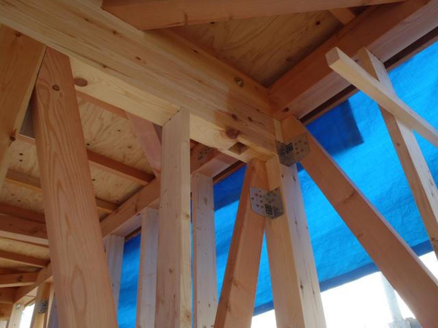 ・上棟おめでとうございます、天候に恵まれ屋根下地まで 工事を進めることが出来ました。 ・木工事、建物耐力壁となります、筋カイを入れ、構造金物 取付、間柱入れを進めています。 ・金物取付後、窓サッシ開口造作、ベランダ下地造作へと 予定しています。