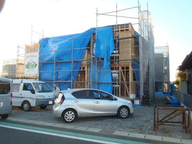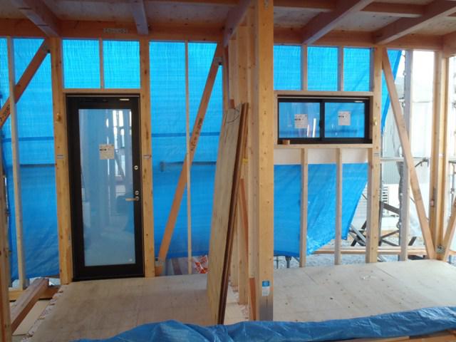 ・木工事、サッシ取付、ベランダ下地造作、壁下地材打ち、 防腐防蟻処理を行いました。ベランダFRP防水後、取り合い サッシ(AW-11・AW-12)取付検査機構(中間検査) 保証機構JIO(構造躯体検査)を受けます。
