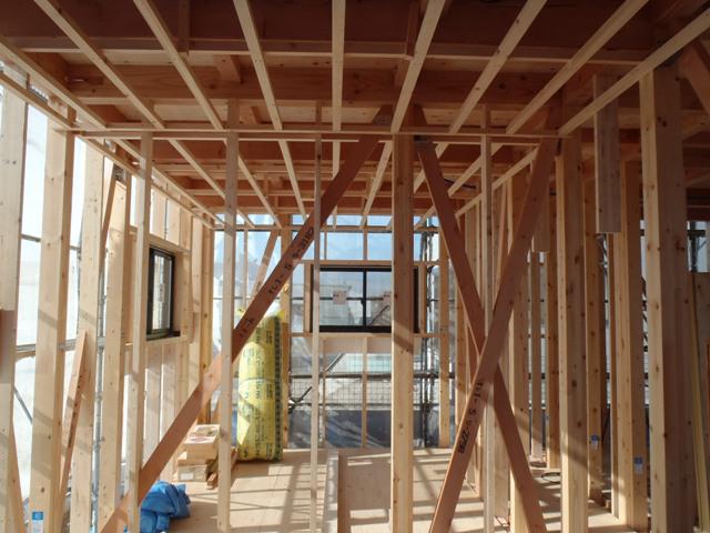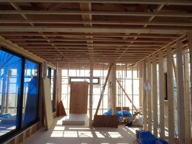 ・木工事、ベランダFRP防水、検査機構・保証機構による 中間検査を受けました。 ・外壁下地シート貼りを行い構造材等 雨水にて濡れなくなり 内部給排水・電気配線配管天井断熱材入れ、天井ボード貼り へと進めて行きます。