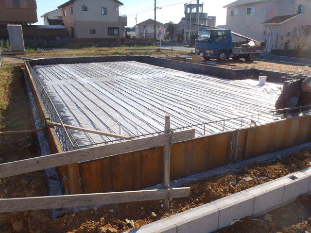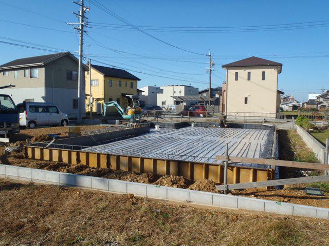 ・基礎工事、砕石地業、土間シート敷き、ベース型枠組み、 鉄筋加工・鉄筋組みを進めています。 ・鉄筋組み完了後、保証機構による配筋検査を受け、ベース コンクリート打ちを予定しています。