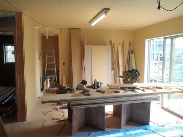 ・内部木工事、ドア開口枠を取付ながら枠廻り取り合いボード