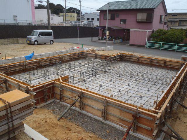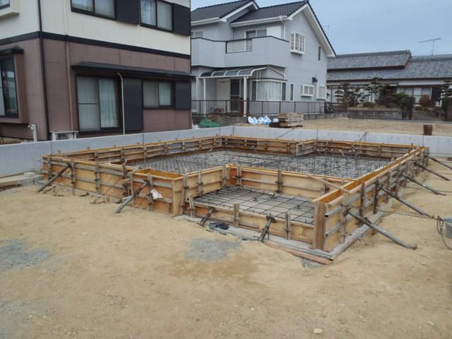 ・20日 保証機構JIOによる配筋検査(鉄筋組み状況、型枠との 間隔等確認)を受け、建物外周部内側型枠組み、給排水用 土間逃げ配管を設置しました。 ・基礎ベース部・立上り型枠部コンクリート打ち、内部布基礎部 型枠組み、アンカーボルト類設置へと進めて行きます。