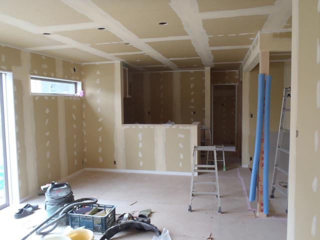 ・外部足場が解体され建物全景を確認できるようになりました。 外部工事・給排水埋設管設置、基礎幅木塗り進めて行きます。 ・内装仕上げ工事へと入りました。壁・天井ボード下地処理し クロス下地パテ入れを行っています。パテ下地乾き次第 天井よりクロス貼りを行っていきます。