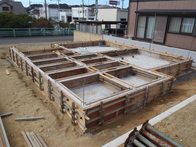 ★先週の工事★ 基礎工事(ベースコンクリート部コンクリート打ち、 内部布基礎部型枠組み、コンクリート養生、他) ★今週の予定工事★ 基礎工事(コンクリート養生、型枠材解体、基礎廻り 排水先行配管、埋戻し・整地、他)