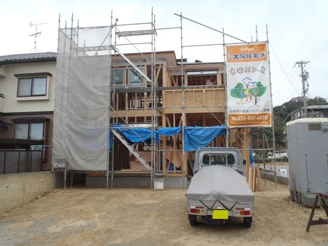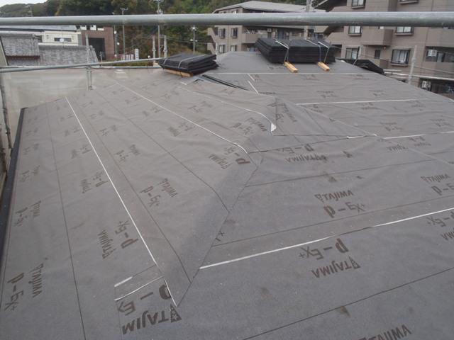 受けました。屋根材荷揚げを行い屋根材葺き、外壁下地シート