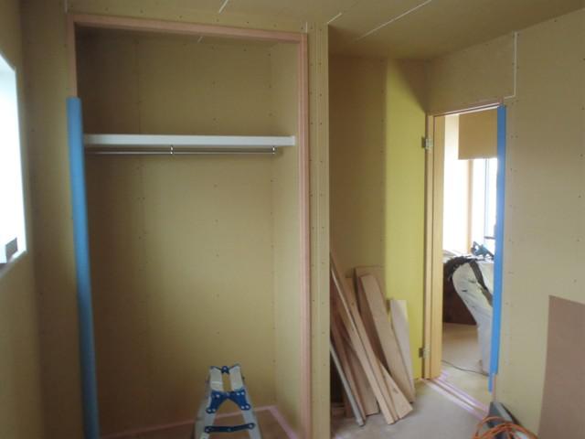 ・外部換気扇フード 電力引込金具、TVアンテナ取付完了 しました。外部点検し外部足場解体予定します。 ・内部木工事 2階より壁ボード納め、固定棚・幅木取付と 行い、建具吊り込み残工事を行い木工事も後わずかとなって きました。