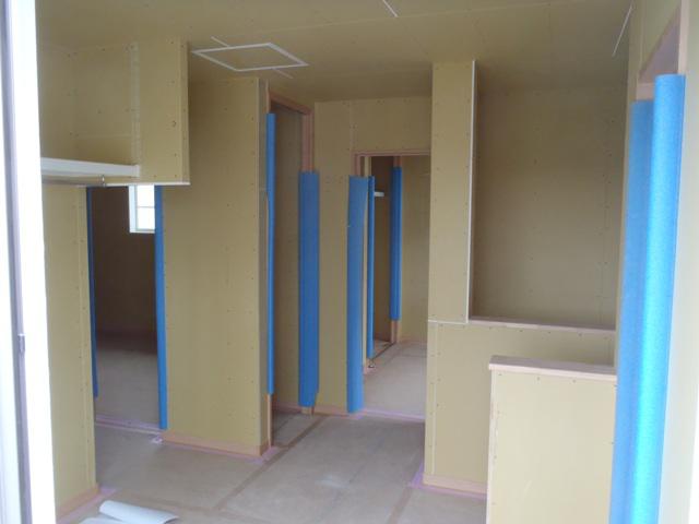 ・外部点検し外部足場解体しました。外部給排水・エコキュート 据付準備へと進めます。 ・キッチン据付設置しLDK生活空間の間隔などが確認できる ようになりました。 ・内部木工事幅木取付、建具吊り込みを行い完了となります。