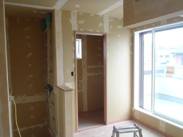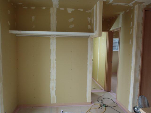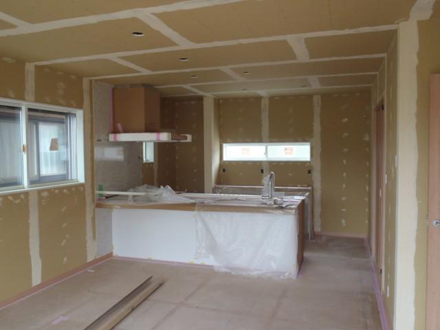 ・内装工事へ入りました。クロス下地・クロスパテを天井・ 壁ボードジョイント部、ビス頭へ入れ、段差等下地処理を 行い、クロス貼りを行います。