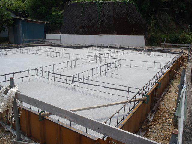 ・基礎工事、鉄筋加工・鉄筋組みを終え、保証機構JIOによる 配筋検査(設計仕様の鉄筋にて鉄筋組み、コンクリートとの 間隔等)を受け、ベースコンクリート打設しました。 ・ベース型枠解体し、立ち上がり部型枠組みにアンカーボルト 類設置、立上り部コンクリート打ちへと進めていきます。