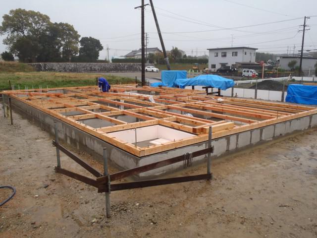 ・土台下地木材が搬入され土台据え、床下地組みを行い上棟