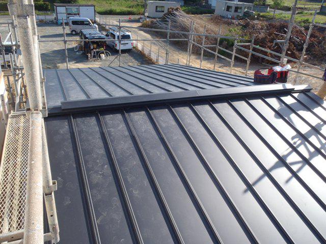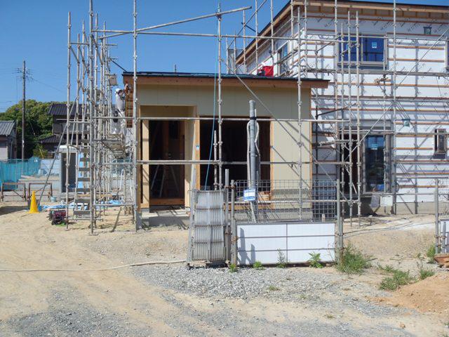 ★先週の工事★ 木工事(筋違・間柱入れ、構造金物取付、サッシ開口造作 天井下地組み、外壁下地ボード貼り、他) 外部足場組み 防腐防蟻処理 構造検査 屋根工事(ガルバリウム鋼板葺き、棟納め板金、他) 電気内部配管・配線