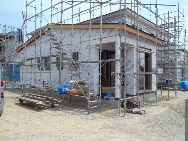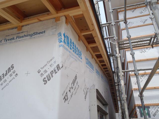 ★先週の工事 木工事(天井ボード貼り、天井断熱材入れ、サッシ取付、 床フローリング貼り、軒天下地組み、軒天ボード貼り、他) 外装透湿防水シート貼り