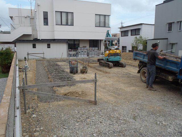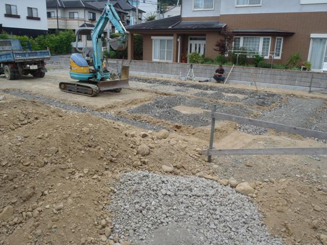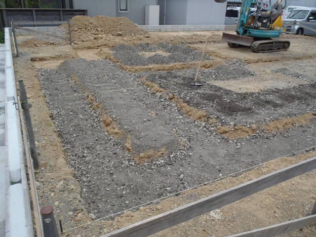 ・基礎工事へ着手しました、基礎高さ基準となる(丁張)を 行い、掘削、砕石地業を進めています。 ・砕石敷き後、土間シート敷き、ベース型枠組み、鉄筋加工・ 鉄筋組みへと順次行ってきます。