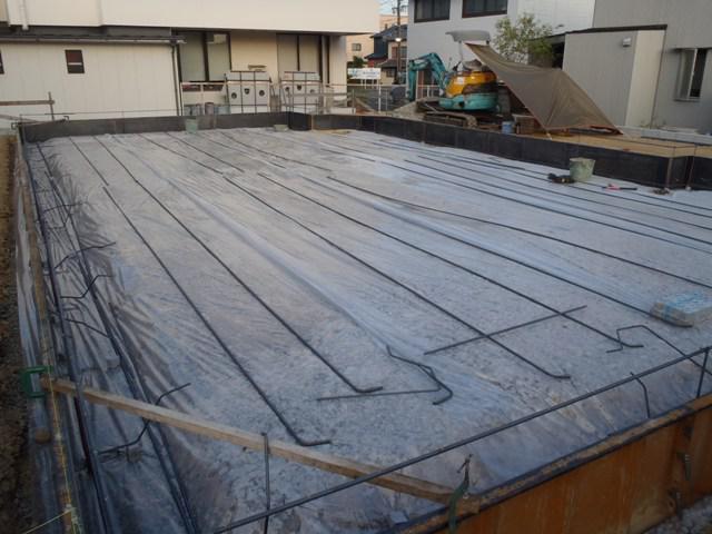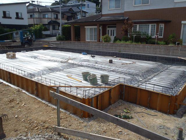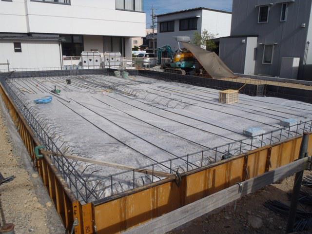 ・基礎工事、土間シート敷き、ベース型枠組み、鉄筋加工・ 鉄筋組みを進めています。 ・鉄筋を組み終えましたら、保証機構JIOによる配筋検査(鉄筋 組み状況、型枠と鉄筋との間隔等確認)を受け、ベースコン クリート打ちを予定しています。