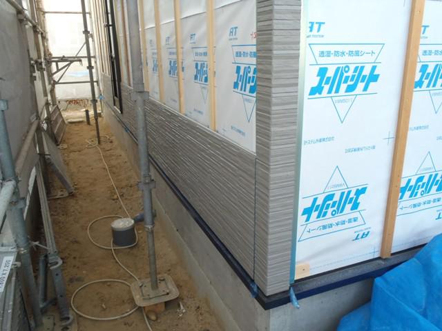 ボード貼りを納め、外壁工事に入り角コーナー役物を取付