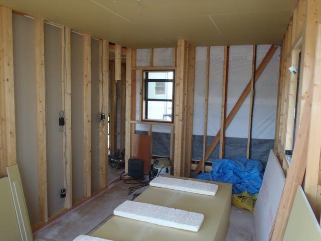・外部点検を行い、ベランダアルミ笠木下地(通気・防水) 処理し寸法取りを行いました。 ・外部足場解体後、アルミ笠木取付となります。 ・内部木工事、先週より引き続き2階壁断熱材入れ、壁ボード 下地合板貼りが進んでいます。