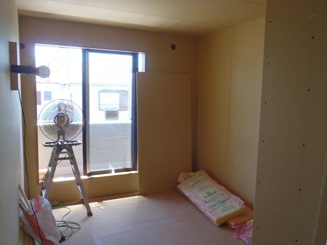 ・内部木工事、先週より引き続き2階壁断熱材入れ、壁ボード 貼りが進み各部屋が間仕切られてきました。 ・ドア枠取付取付、枠取り合いボード納め、固定棚類取付、 幅木取付へと進めます。