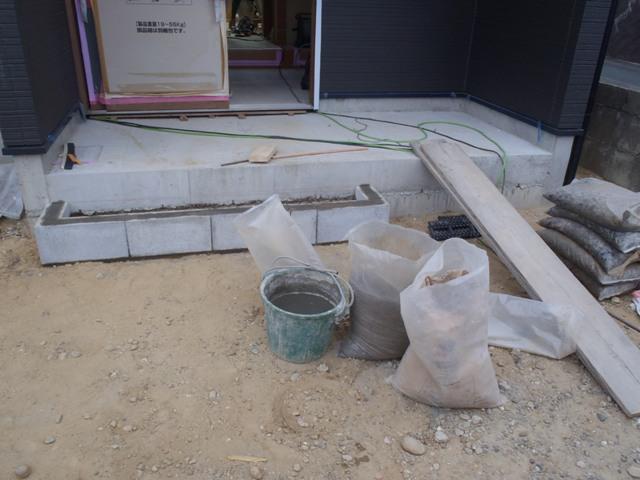 ・外部工事、基礎幅木塗り、玄関ポーチタイル下地、勝手口