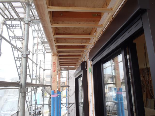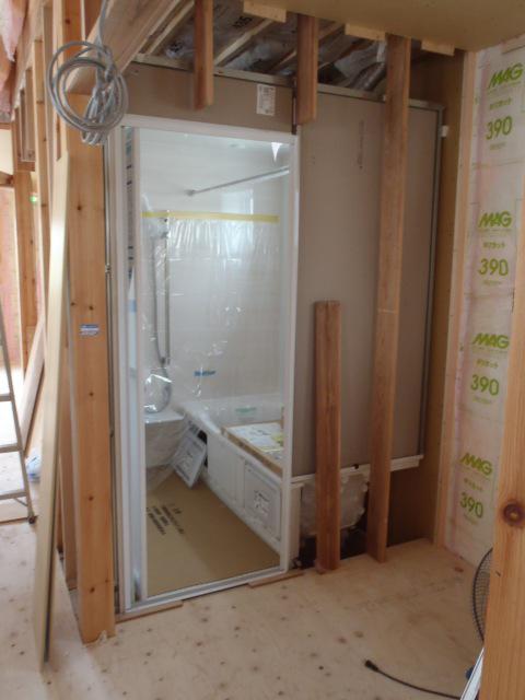 ・29日ユニットバス据付を行いました。浴槽エプロン・点検口 開けてありますが、仕上げ工事時に通水試験確認後に閉じま す。木工事、外部外壁下地材打ち、軒天下地組み、内部1階 壁断熱材入れ、床フローリング貼りに取り掛かりました。