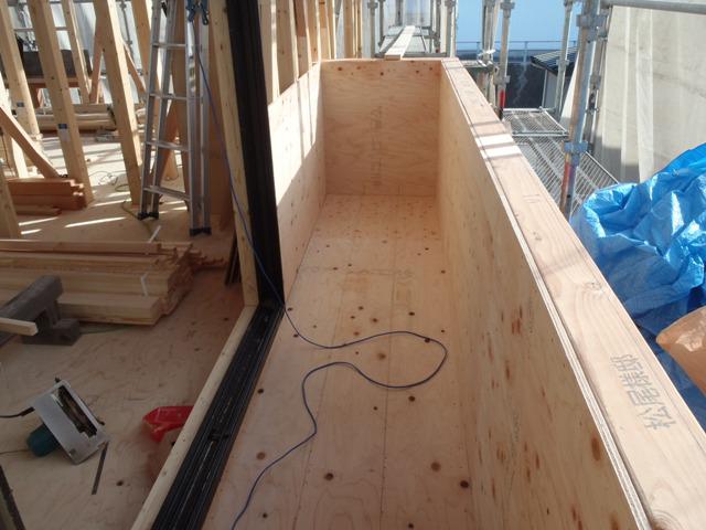 ベランダ下地防水造作、窓サッシ開口造作、サッシ取付へと