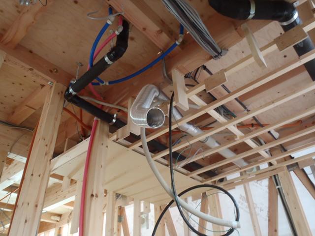 ・15日ユニットバス据付設置しました。浴槽エプロン部取付て ありませんが、給水・給湯、追い焚き管、通水試験(仕上げ 工事時)後に設置します。 ・木工事2階天井を納め、1階天井下地組み及びボード貼り、外壁 材下地木材打ちへと進めています。