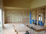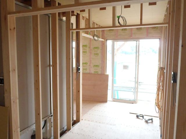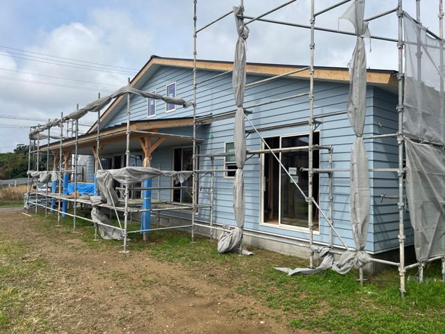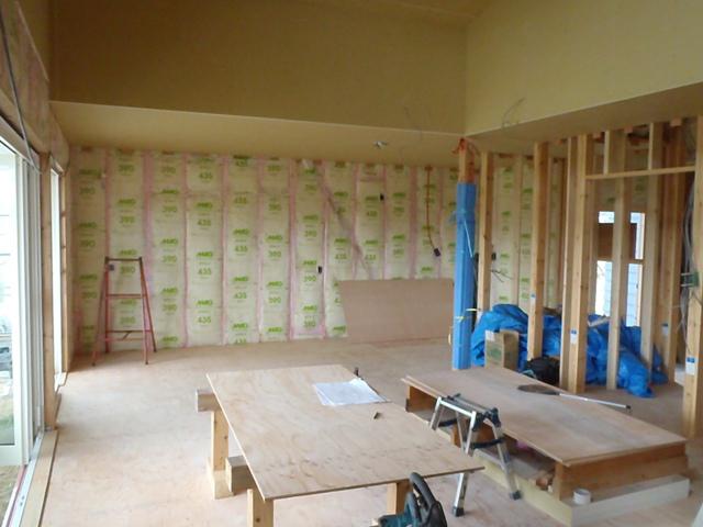 ・外壁ラップサイディング張り防水処理コーキング打ちを 完了しました。 ・内部木工事、軒天ボード残貼り、壁下地打ち、壁断熱材入れを 終え、床フローリング貼りに取り掛かります。